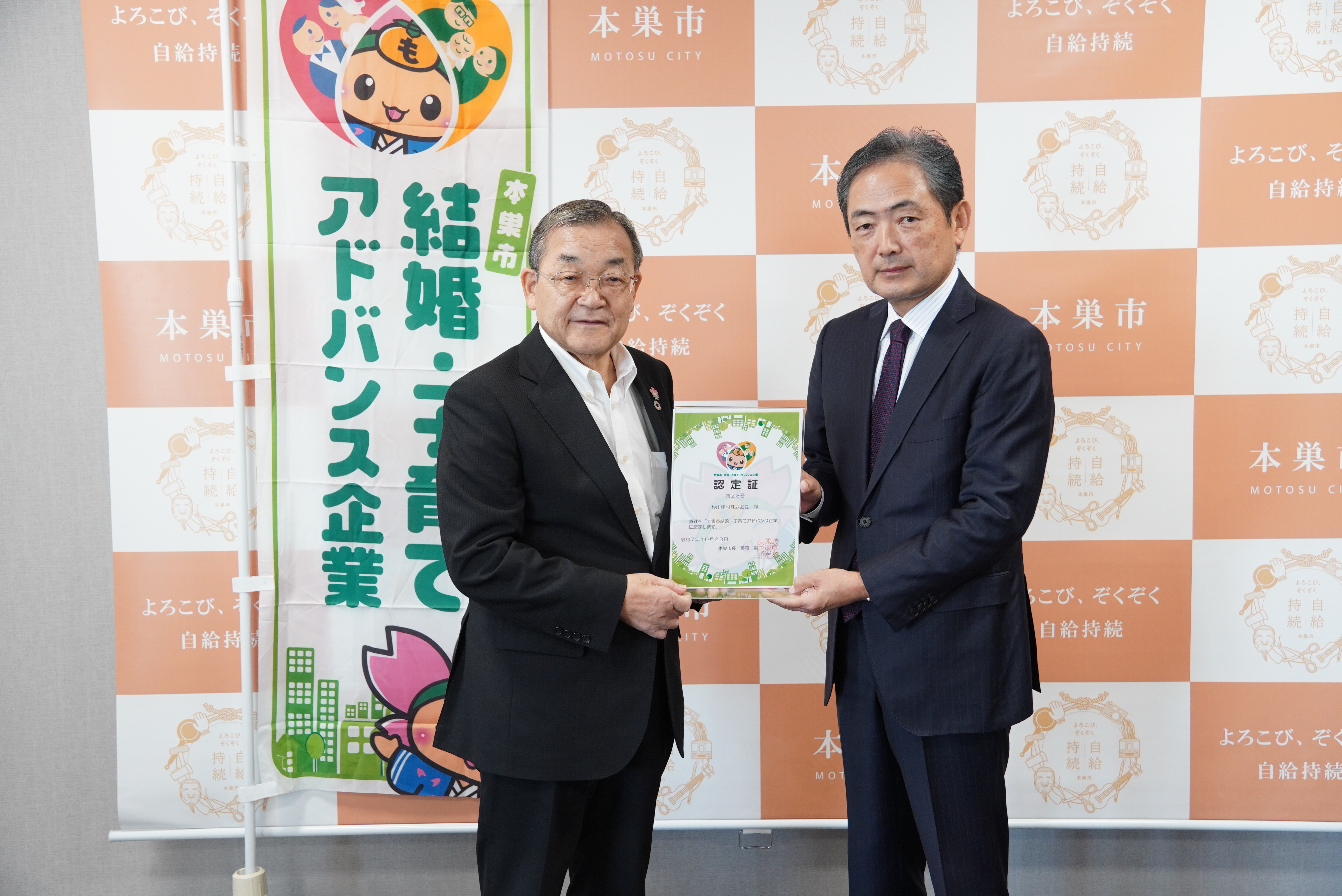 令和7年10月23日、市役所本庁舎にて「令和7年度 本巣市結婚・子育てアドバンス企業 認定証授与式」を開催し、市長より認定企業となった杉山建設株式会社へ認定証を授与しました。
