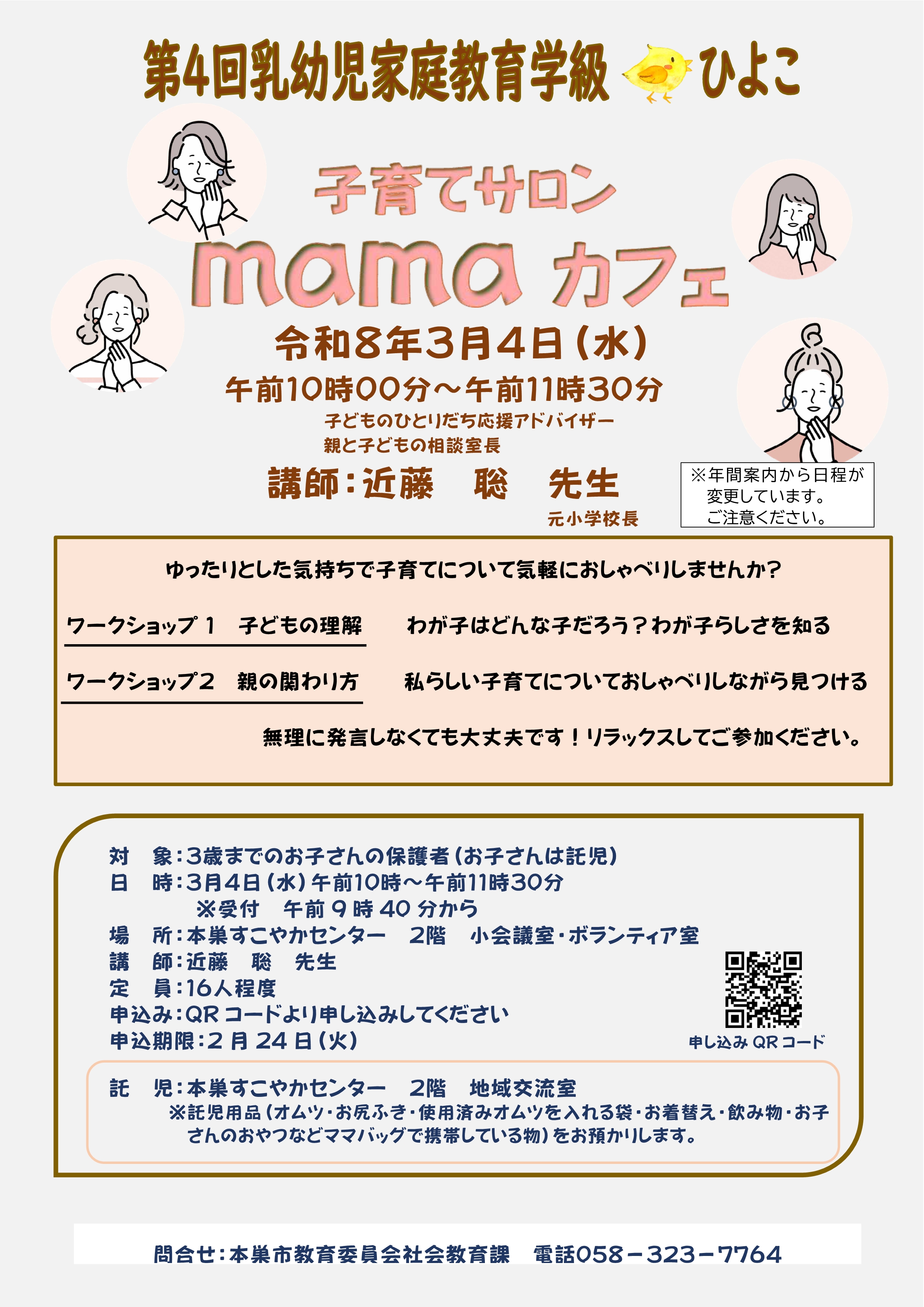 | 第4回 | 3月4日(水) | mamaカフェ | 近藤 聡 先生 | 本巣すこやかセンター2階 |