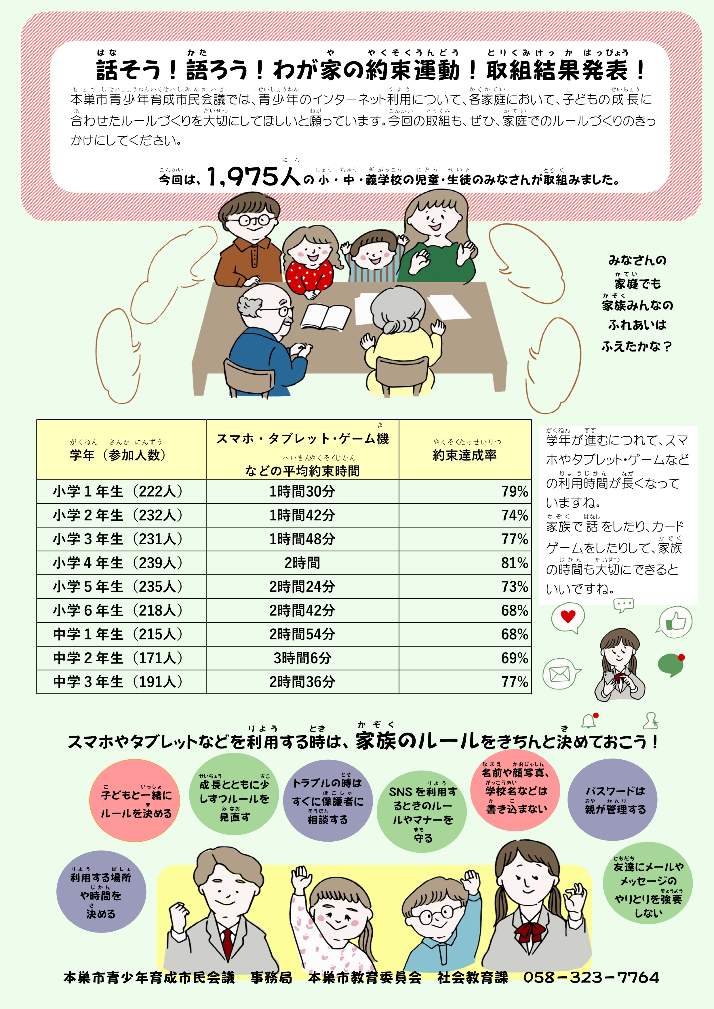 その活動を受けて、本巣市青少年育成市民会議では、通信情報機器やインターネットに起因する青少年の被害者トラブルを防止するため、 情報通信機器やインターネットの取扱いについて、家族で話し合い、家庭での約束づくりと約束を守るための取組みを実施しています。