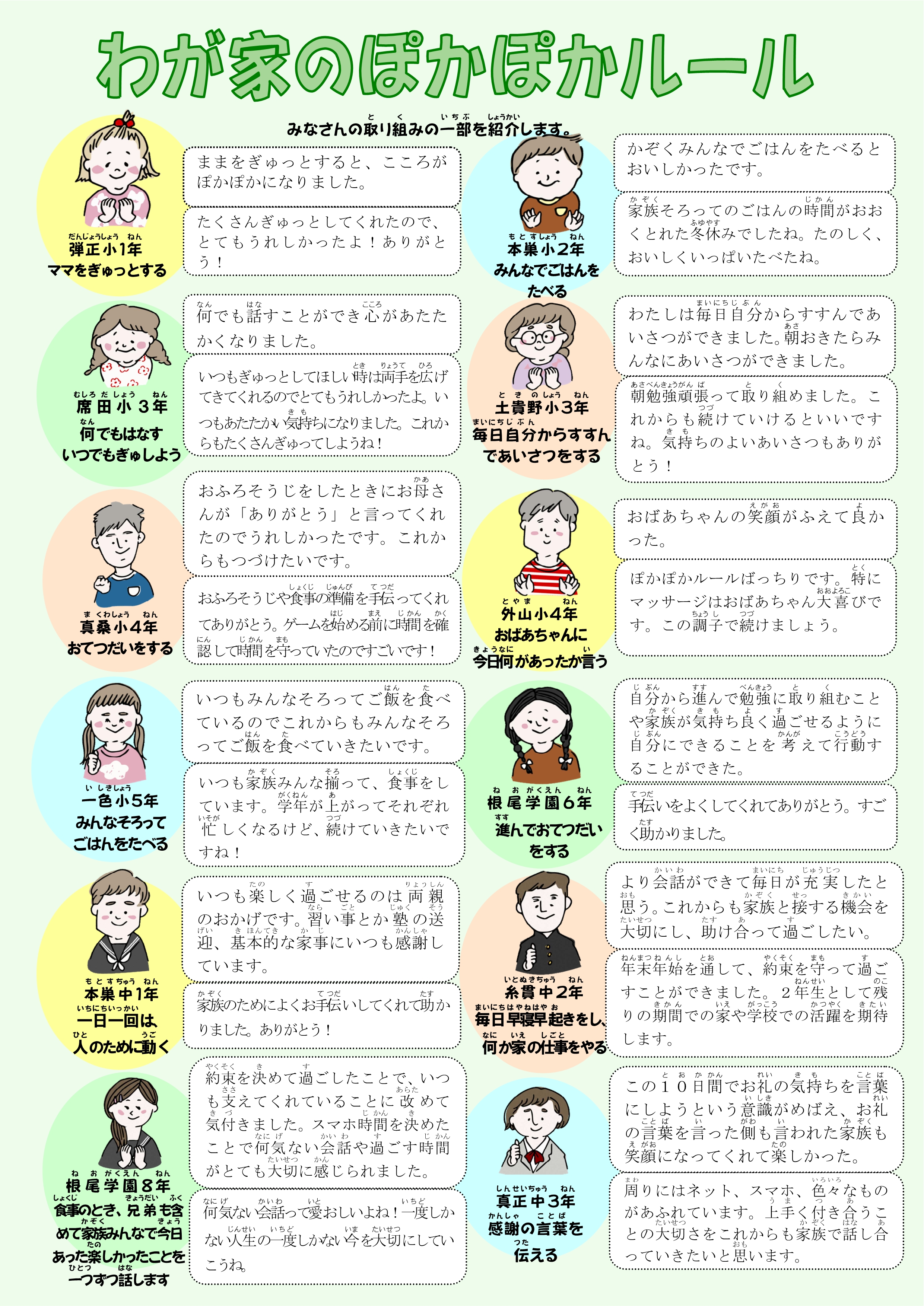 わが家のぽかぽかルールでは、家庭の雰囲気が温かくなるようなルールを各家庭で決めて実施しました。毎日過ごしている家庭の中で改めて「あいさつ」や「感謝の気持ち」「一緒に過ごす」「仲良くする」「お手伝いをする」といったことを意識することで家族の有り難さを実感したという感想が多く寄せられました。