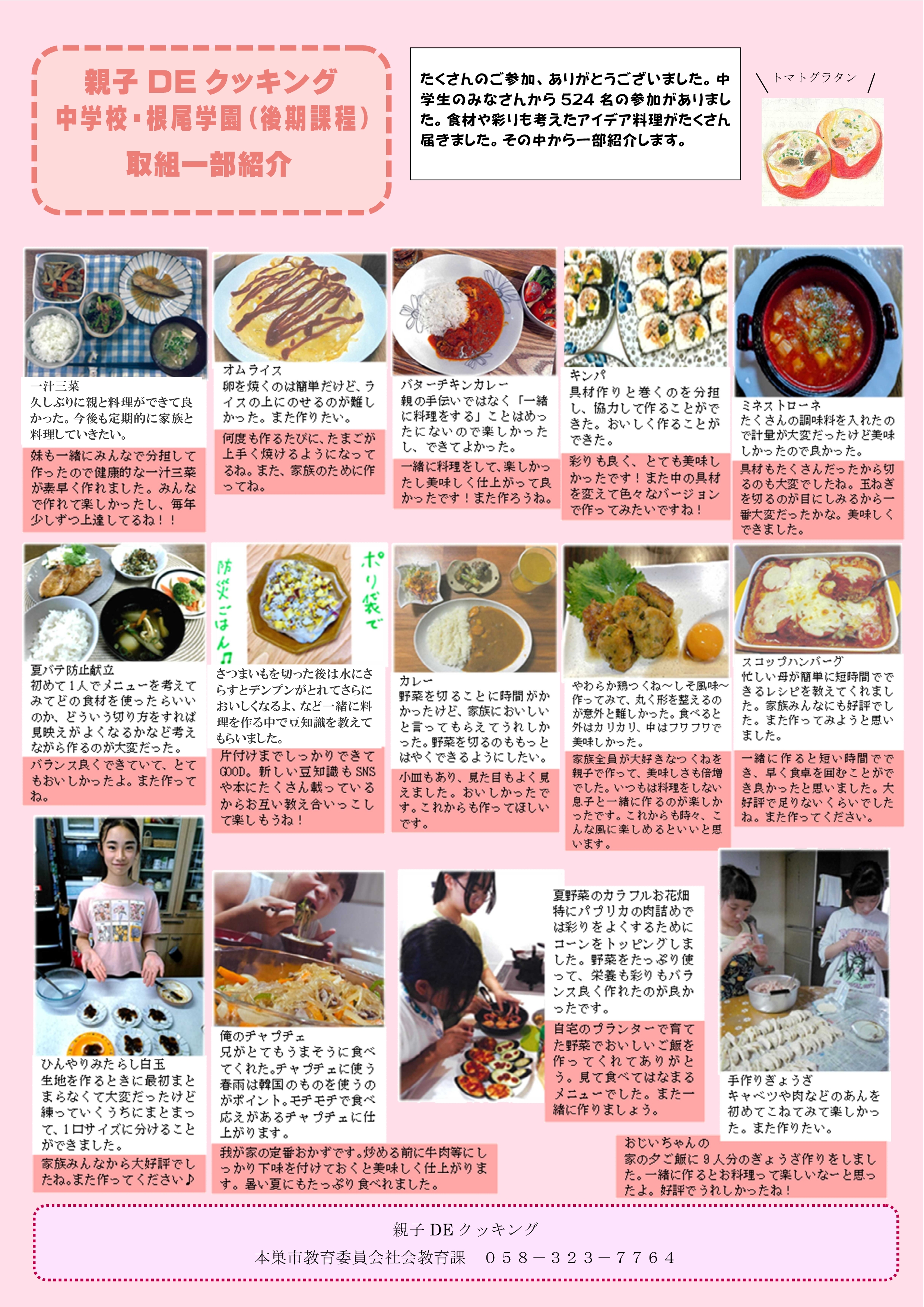 「いつも料理してくれる家族に感謝の気持ちを込めて料理しました」「去年よりできることが増えてとても嬉しかったです」「家族と一緒に料理することができて楽しかったです」「今後ももっと料理のレパートリーを増やせるように練習したいです」などたくさんの感想がありました。