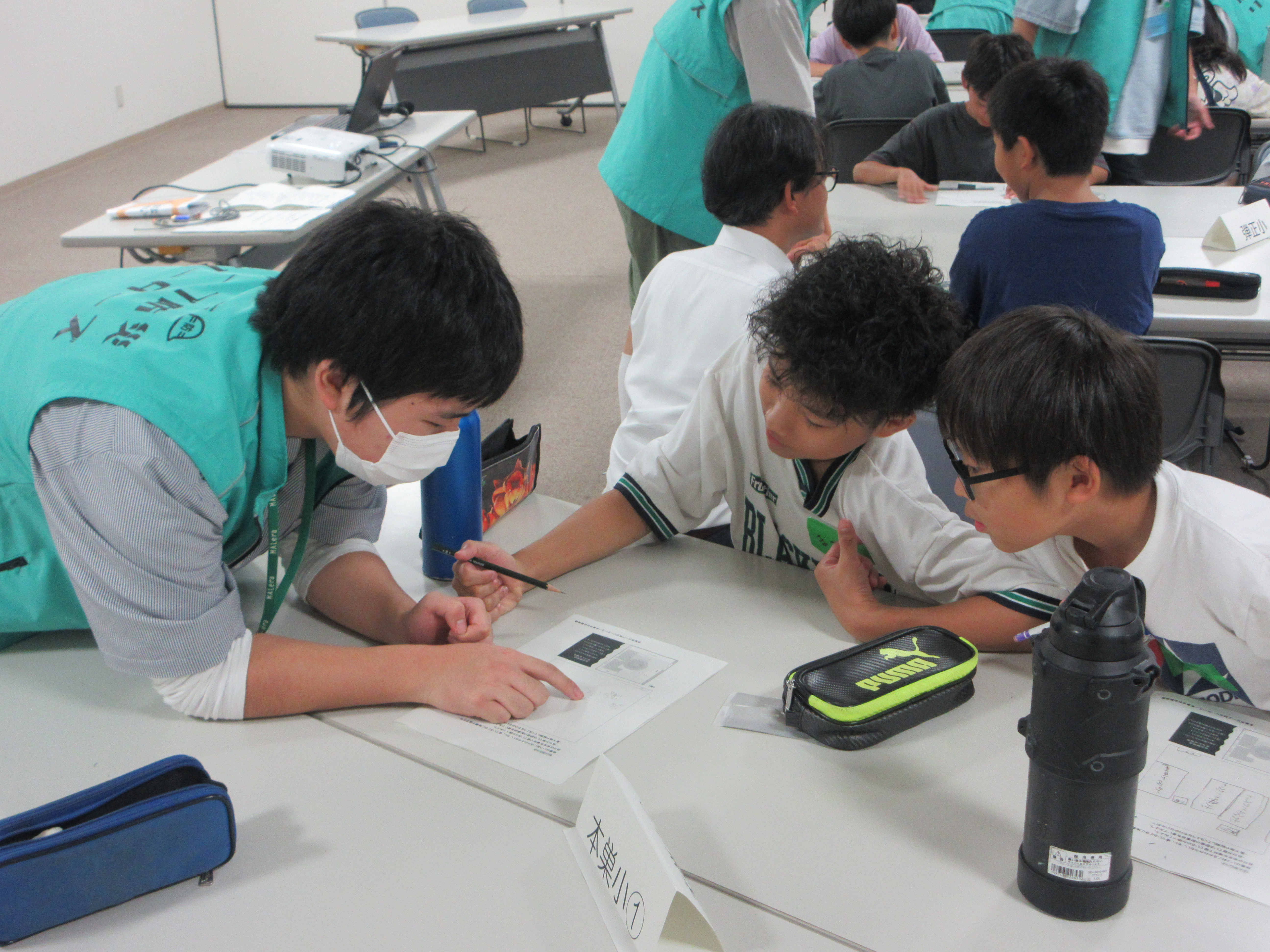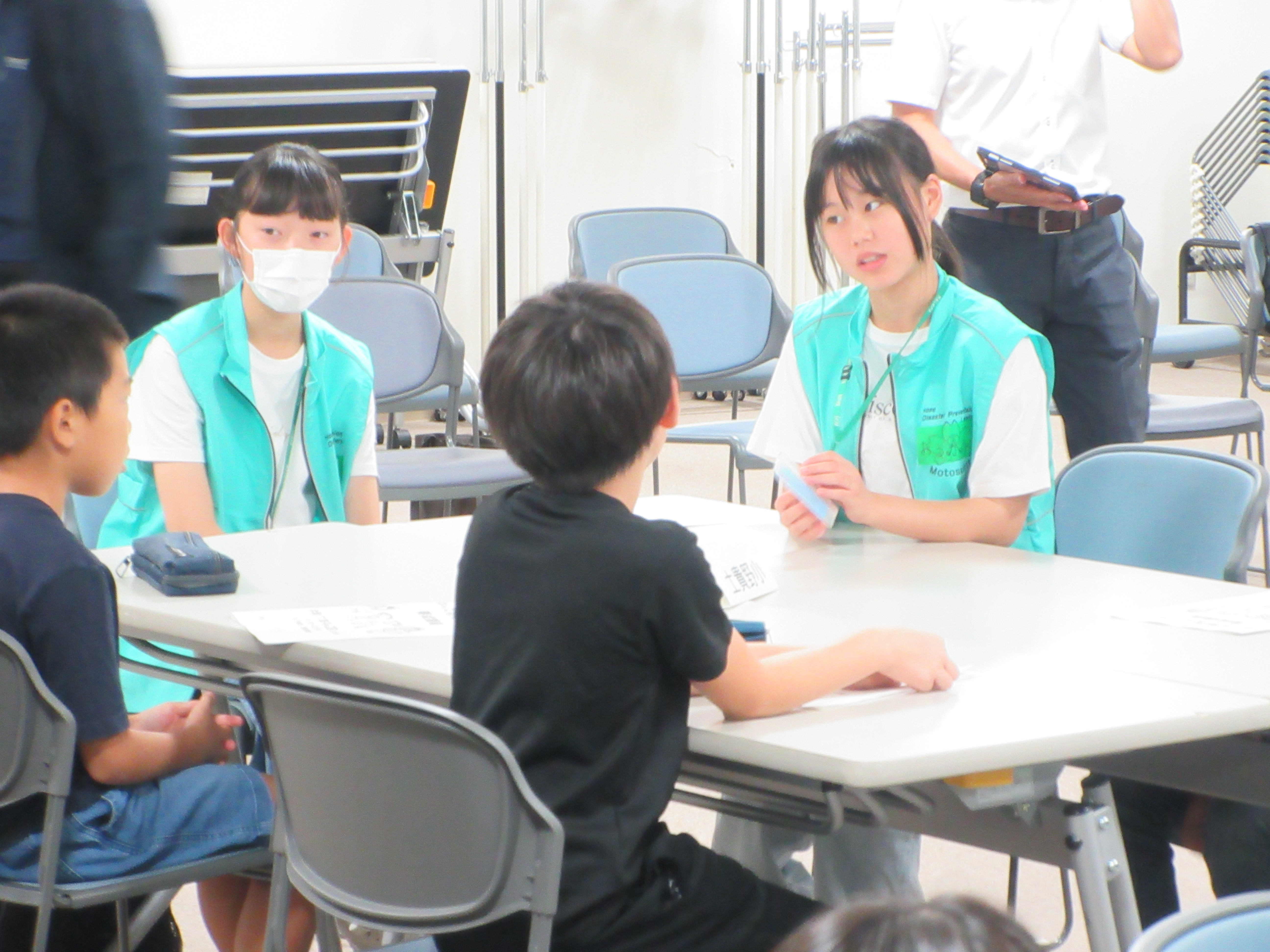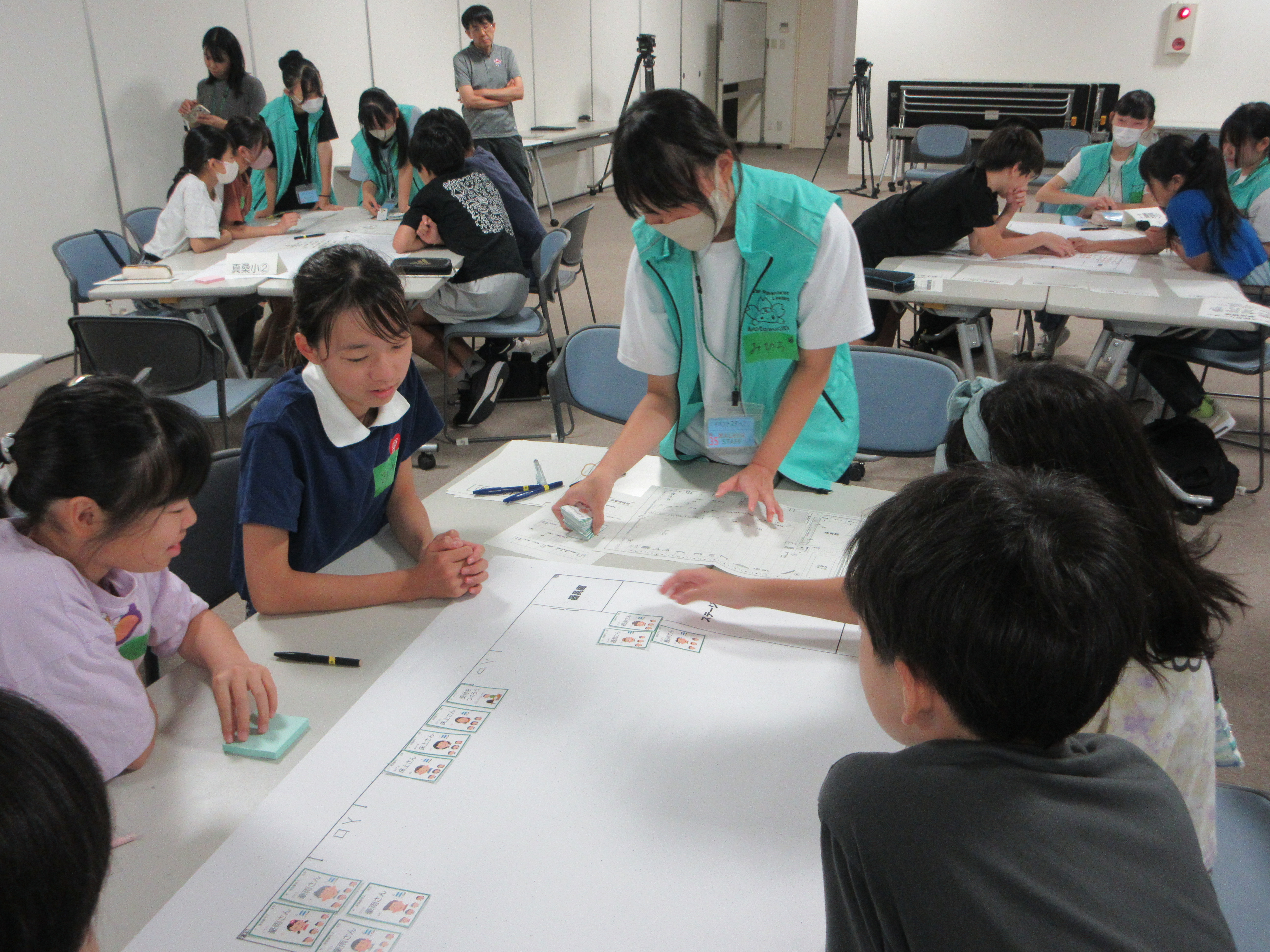 ホープのメンバー12人が分かれて小学校ごとのグループに入り、小学生と一緒に防災・避難所について考えました。