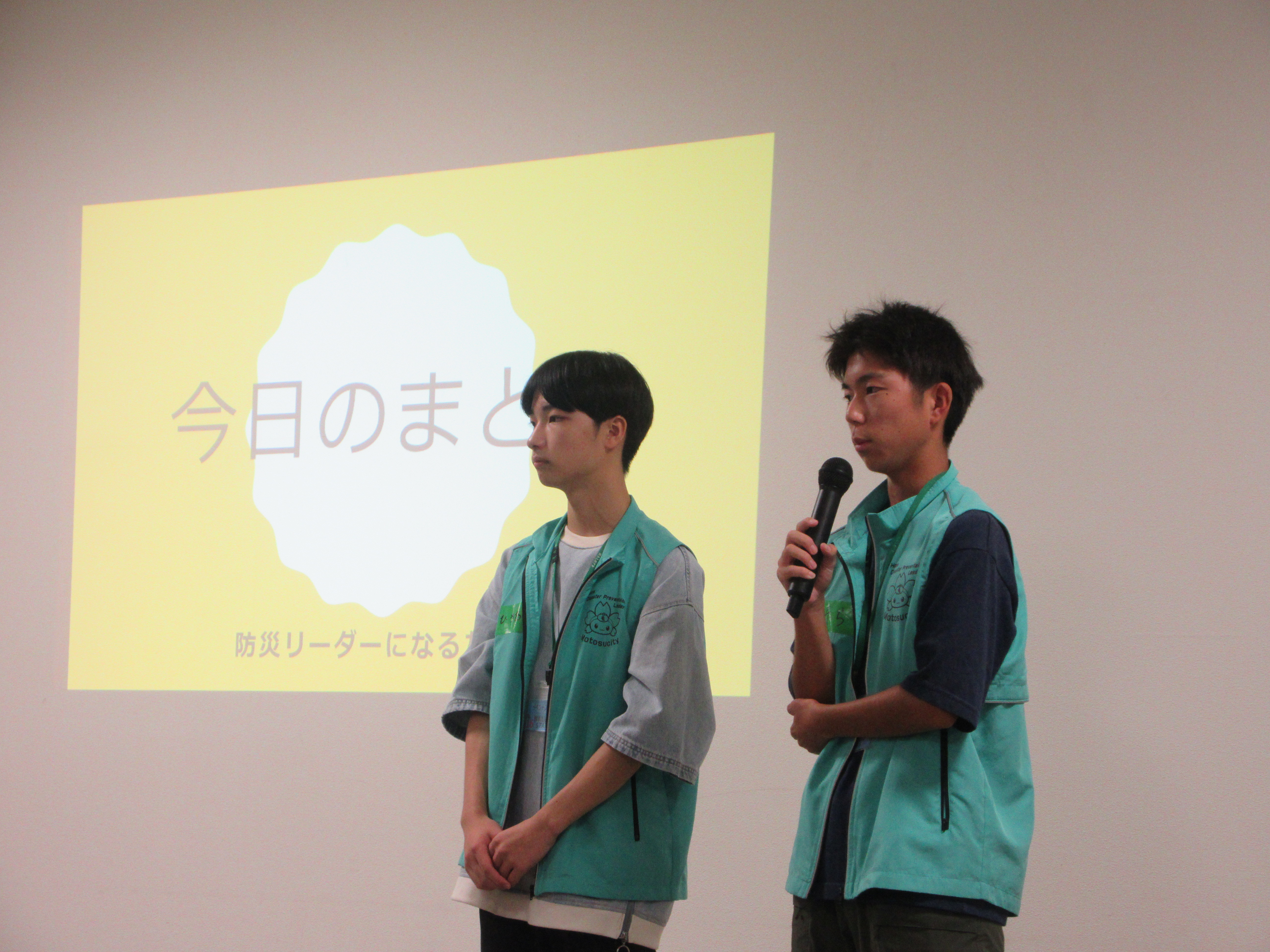 まとめでは、「家族や友達に防災を広めてください」「中学生になったらホープ防災リーダーズとして一緒に活動しましょう」と伝えました。