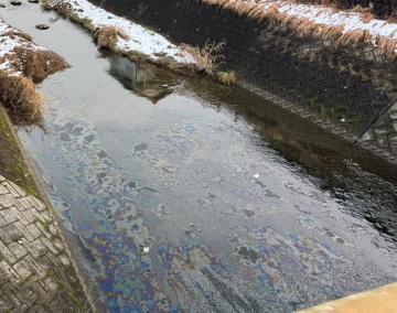 【油漏れにより河川にできた油膜】